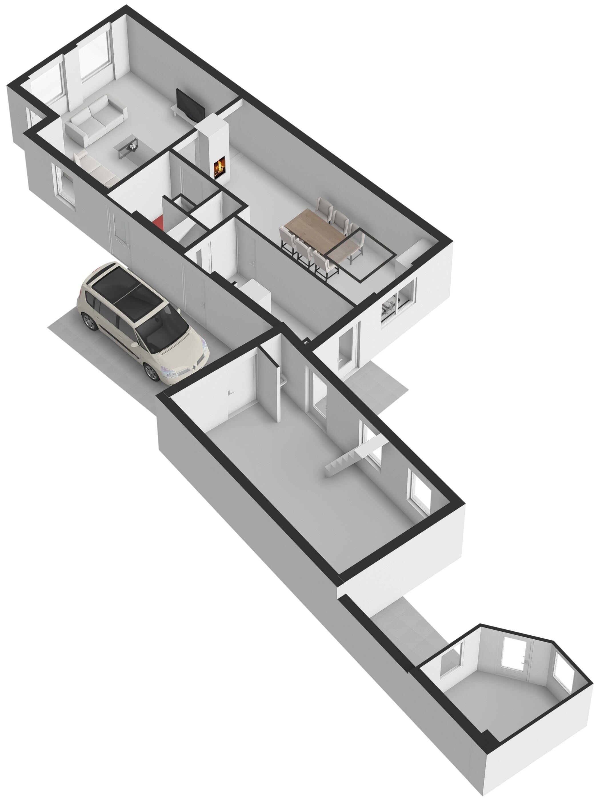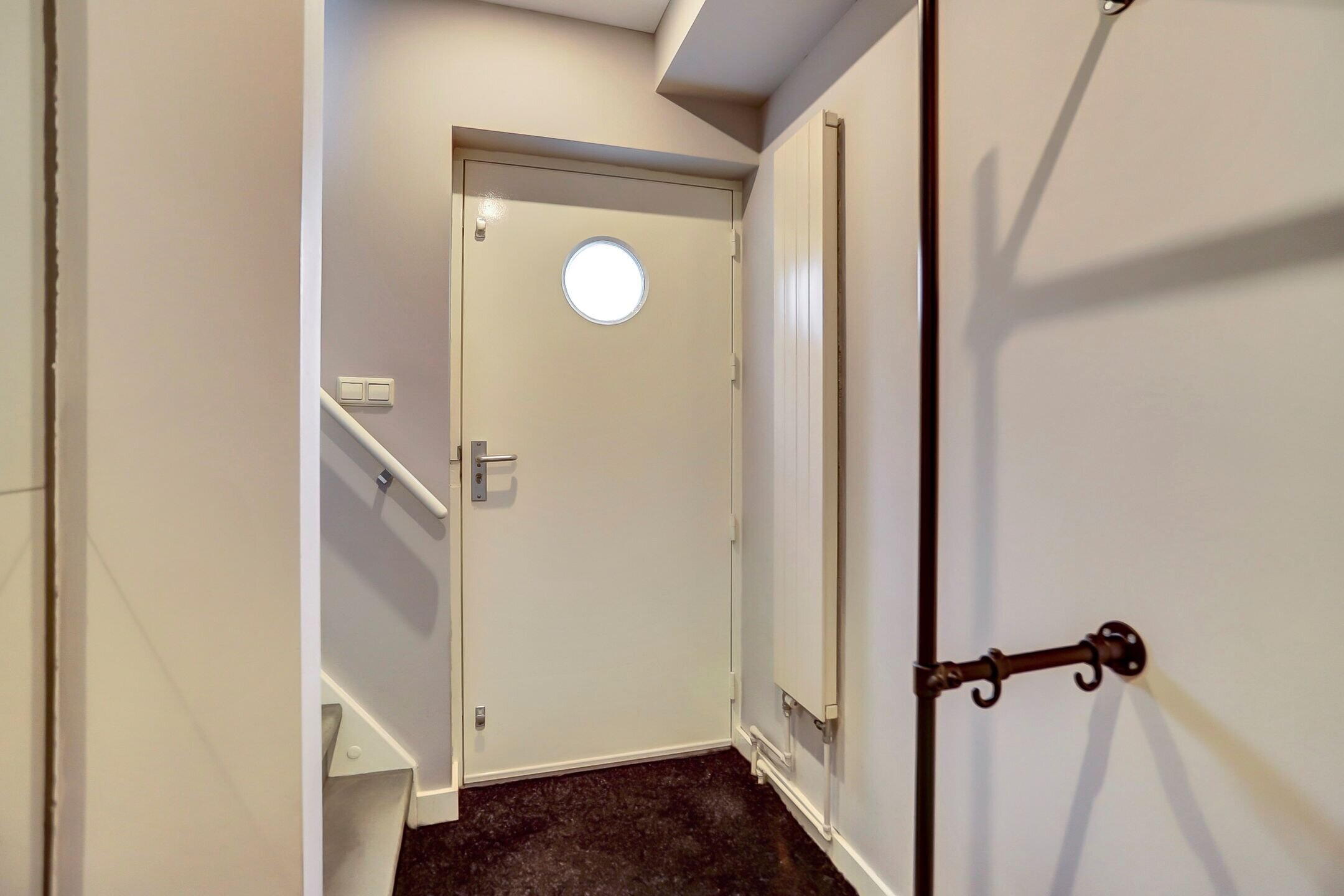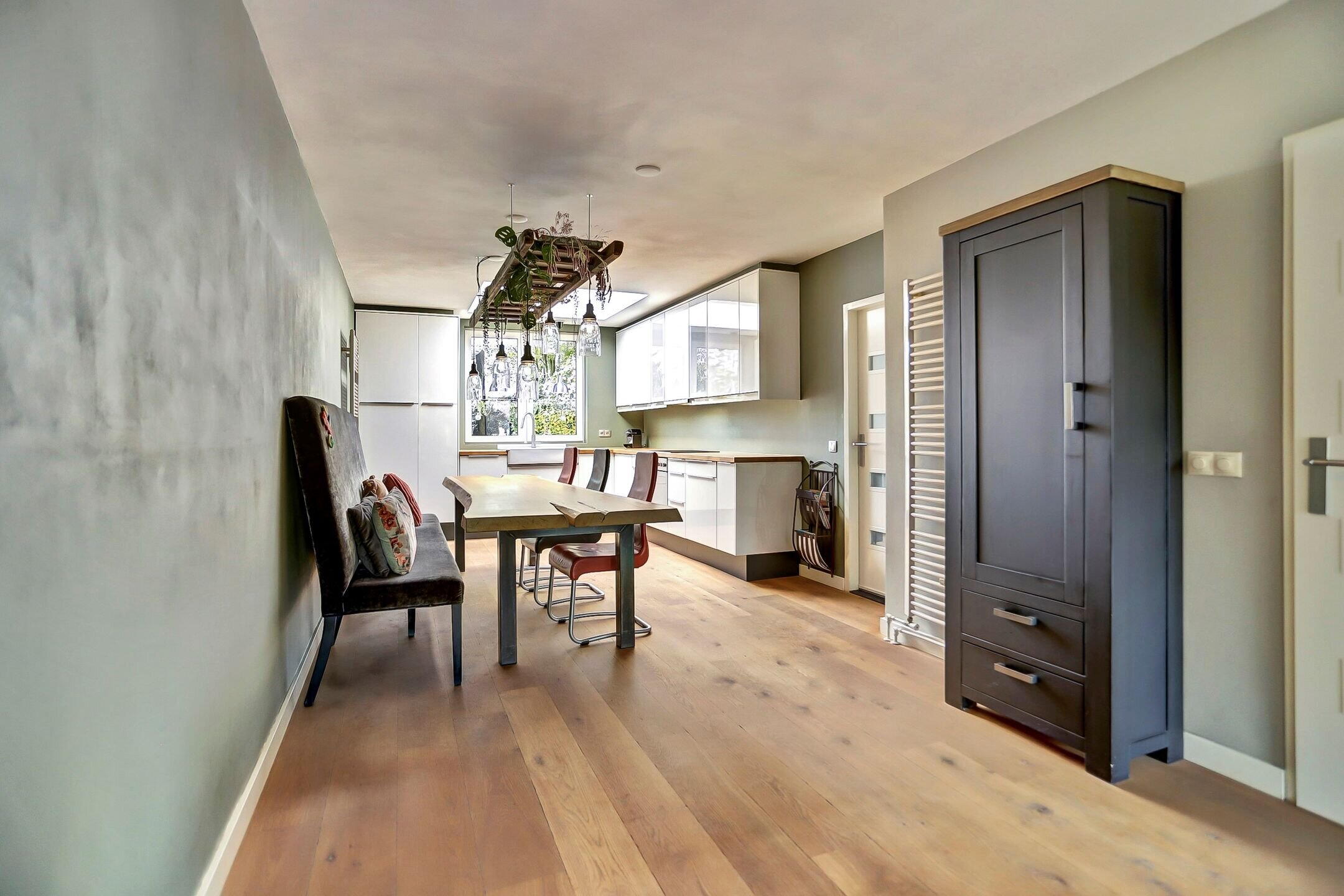 Via de oprit bereik je de voordeur met een karakteristiek rond raam, een leuk detail dat direct bij binnenkomst de woning een eigen gezicht geeft. Je stapt binnen in een ruime hal met de meterkast, een toiletruimte en voldoende plek voor een garderobe. Vanuit hier loop je door naar de leefruimte waar de woning zich echt van zijn mooiste kant laat zien.