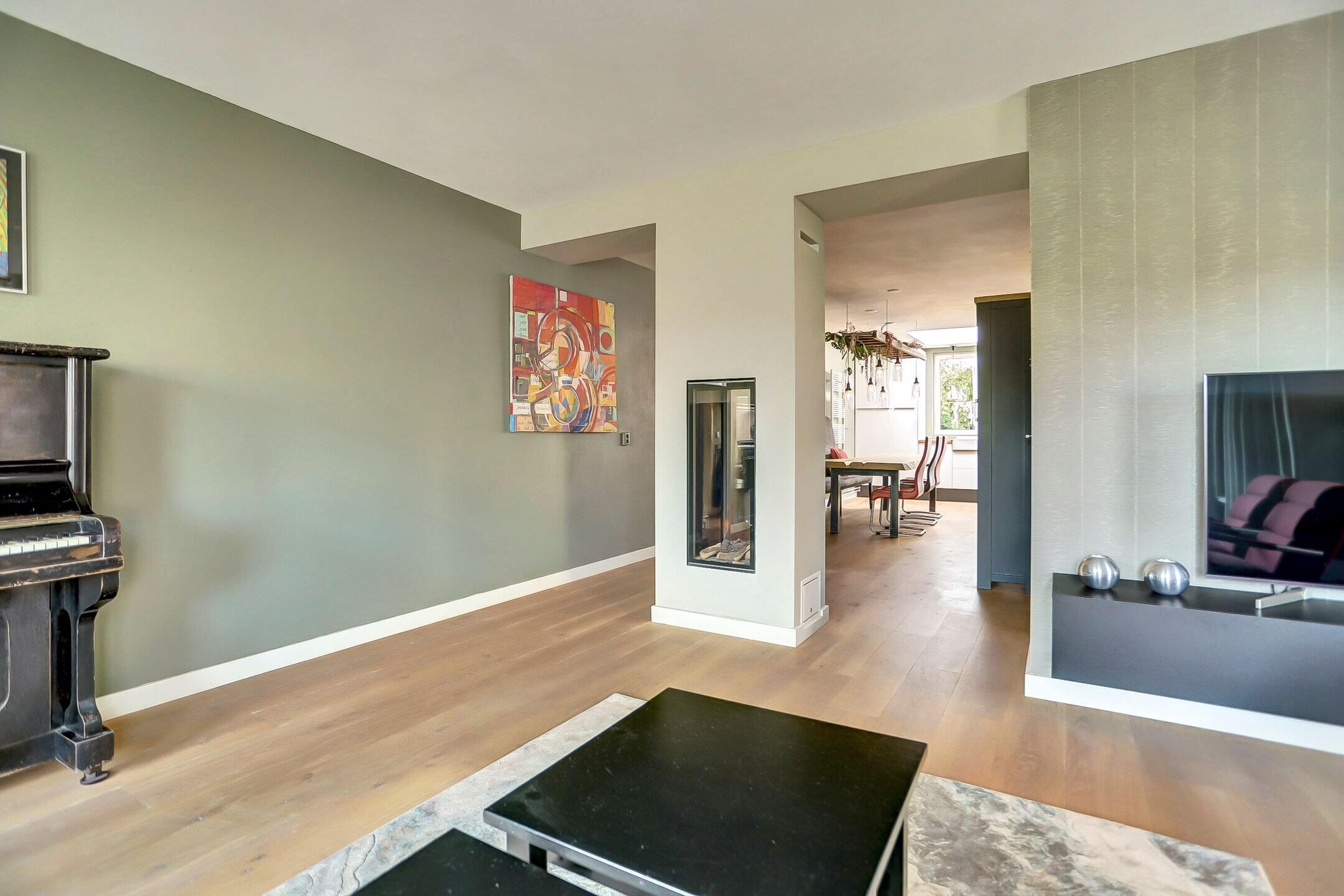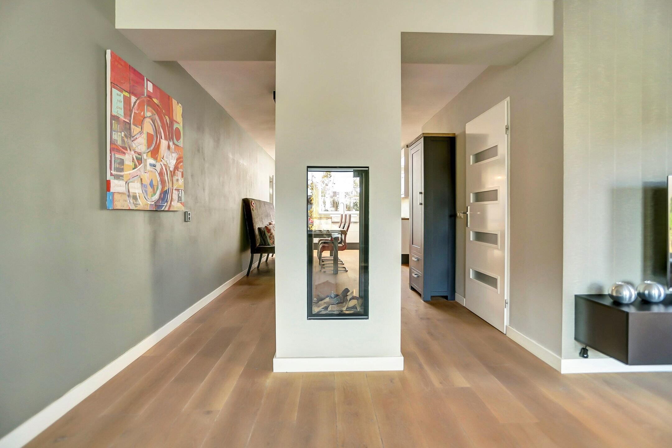 Aan de linkerzijde bevindt zich de woonkamer en rechts de keuken, gescheiden door een stijlvolle doorkijk gashaard. In de woonkamer zorgen vier grote raampartijen, waarvan één met draaikiepfunctie, voor een overvloed aan daglicht en frisse lucht. De eikenhouten vloer en de haard creëren samen een warme, knusse sfeer, terwijl de ruimte groot genoeg is voor meerdere zithoekjes of bijvoorbeeld een speelhoek voor de kinderen.