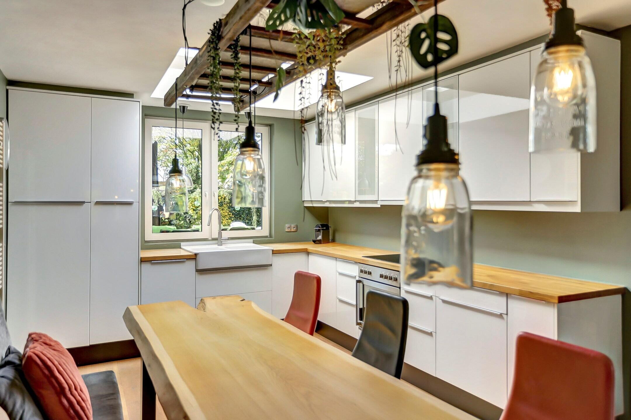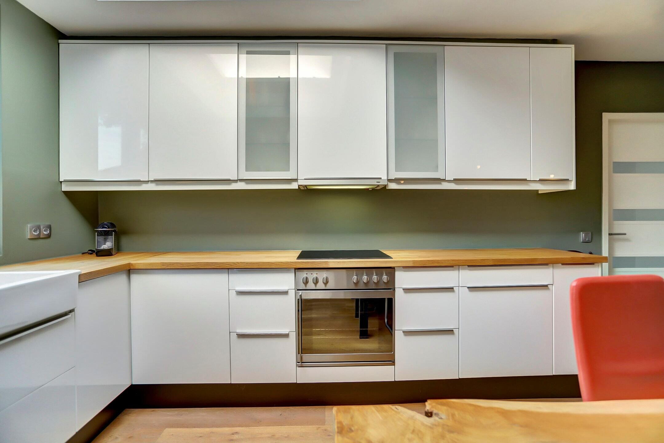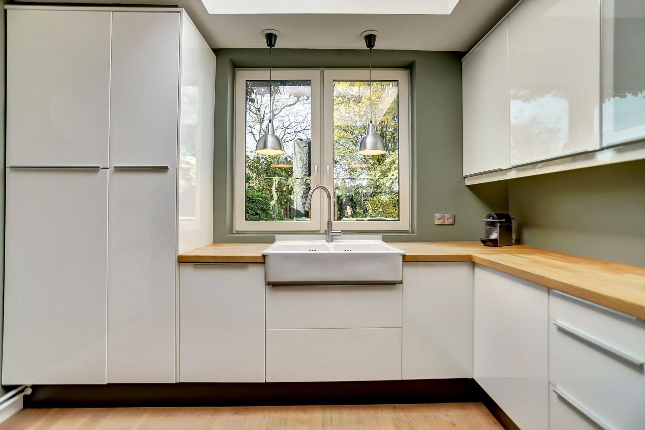 De keuken heeft een moderne, strakke uitstraling met witte keukenkastjes en een houten werkblad. De dubbele spoelbak biedt extra gemak en het vierpits inductiefornuis maakt koken energiezuinig en comfortabel. Verder zijn er een heteluchtoven, koelkast met vriesvak en een handige apothekerskast aanwezig. Dankzij de vele lades en kastjes is er volop opbergruimte voor keukengerei en voorraad. Een raam met uitzicht op de tuin en een grote lichtkoepel in het plafond zorgen voor een lichte en aangename sfeer.