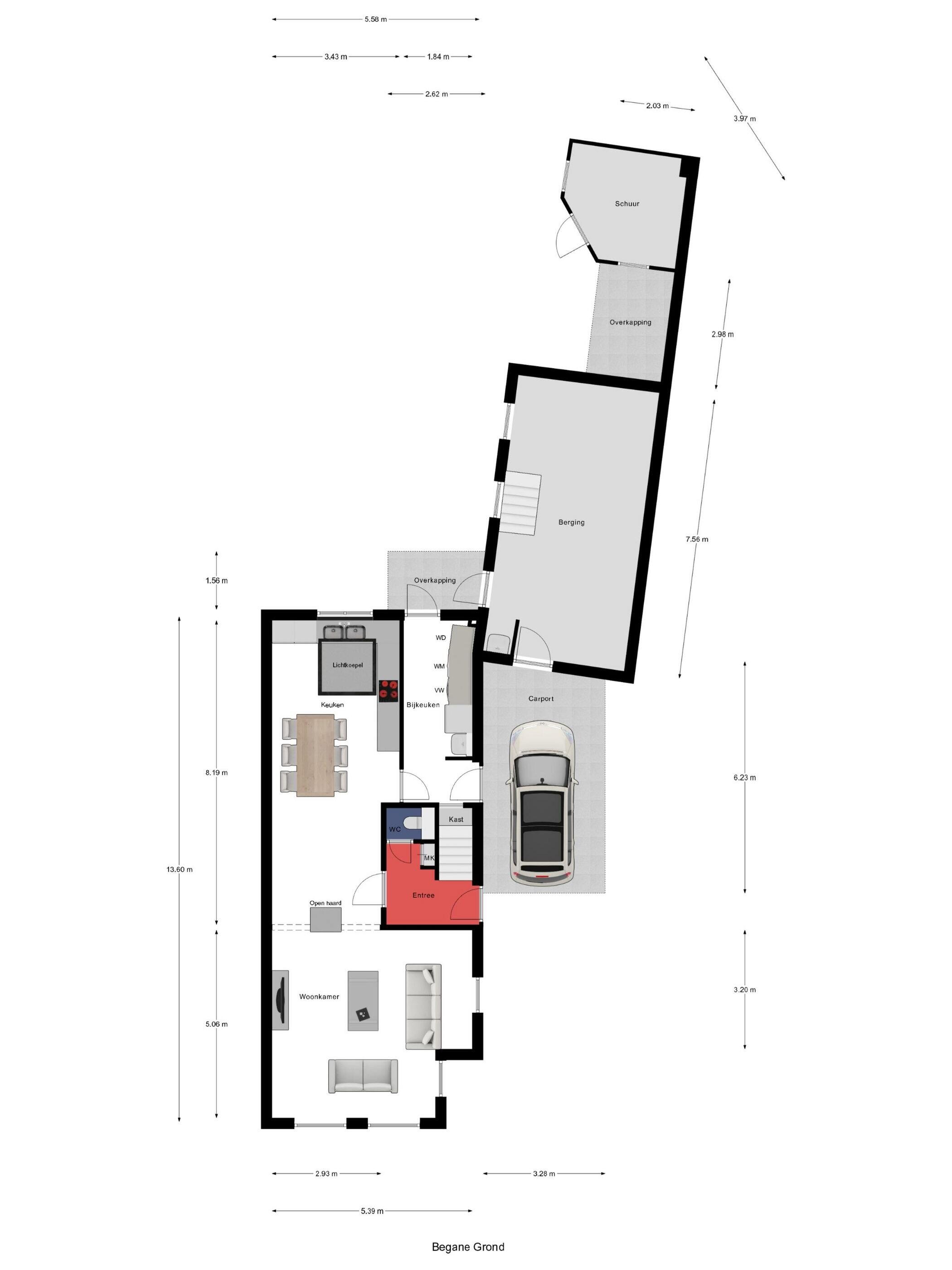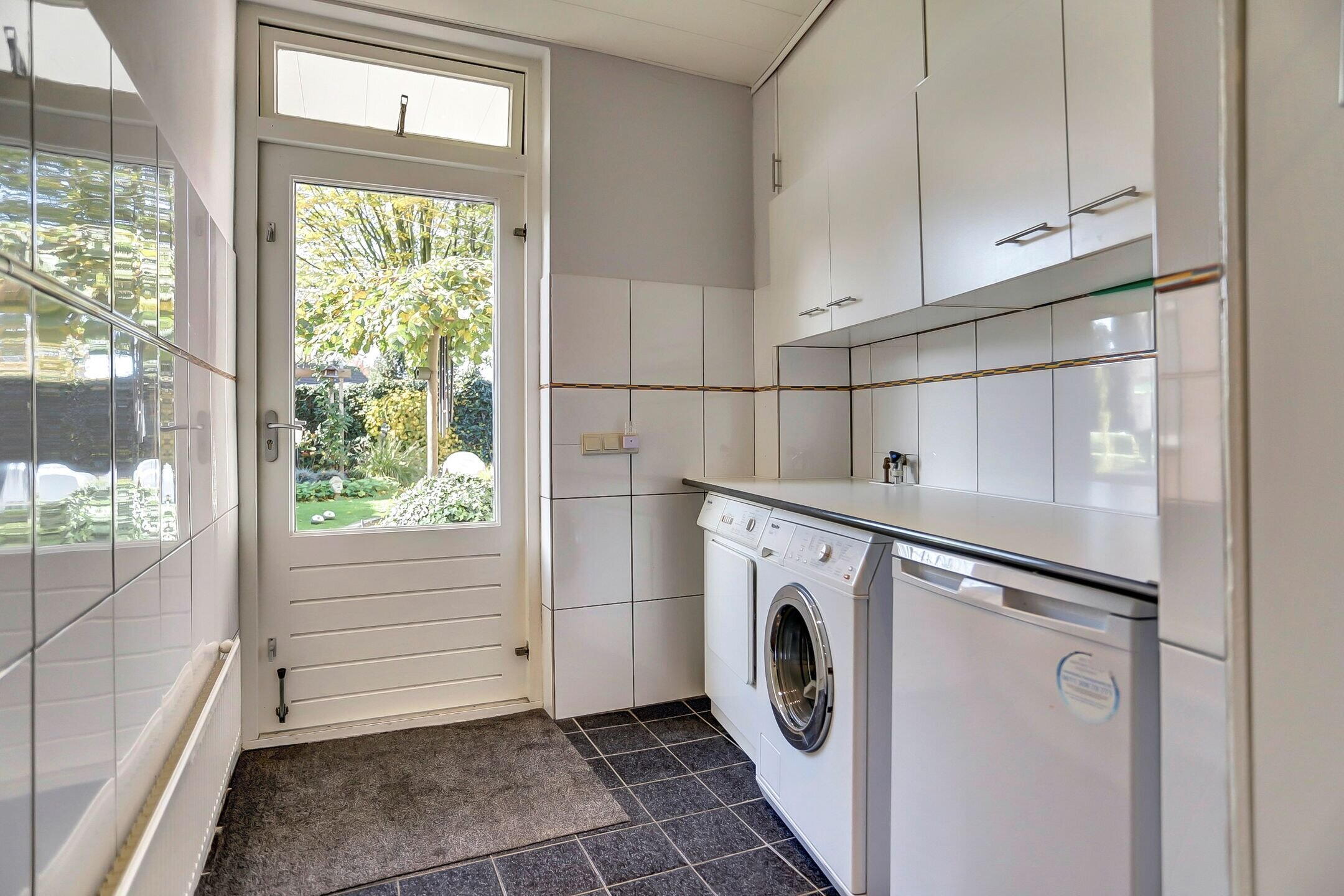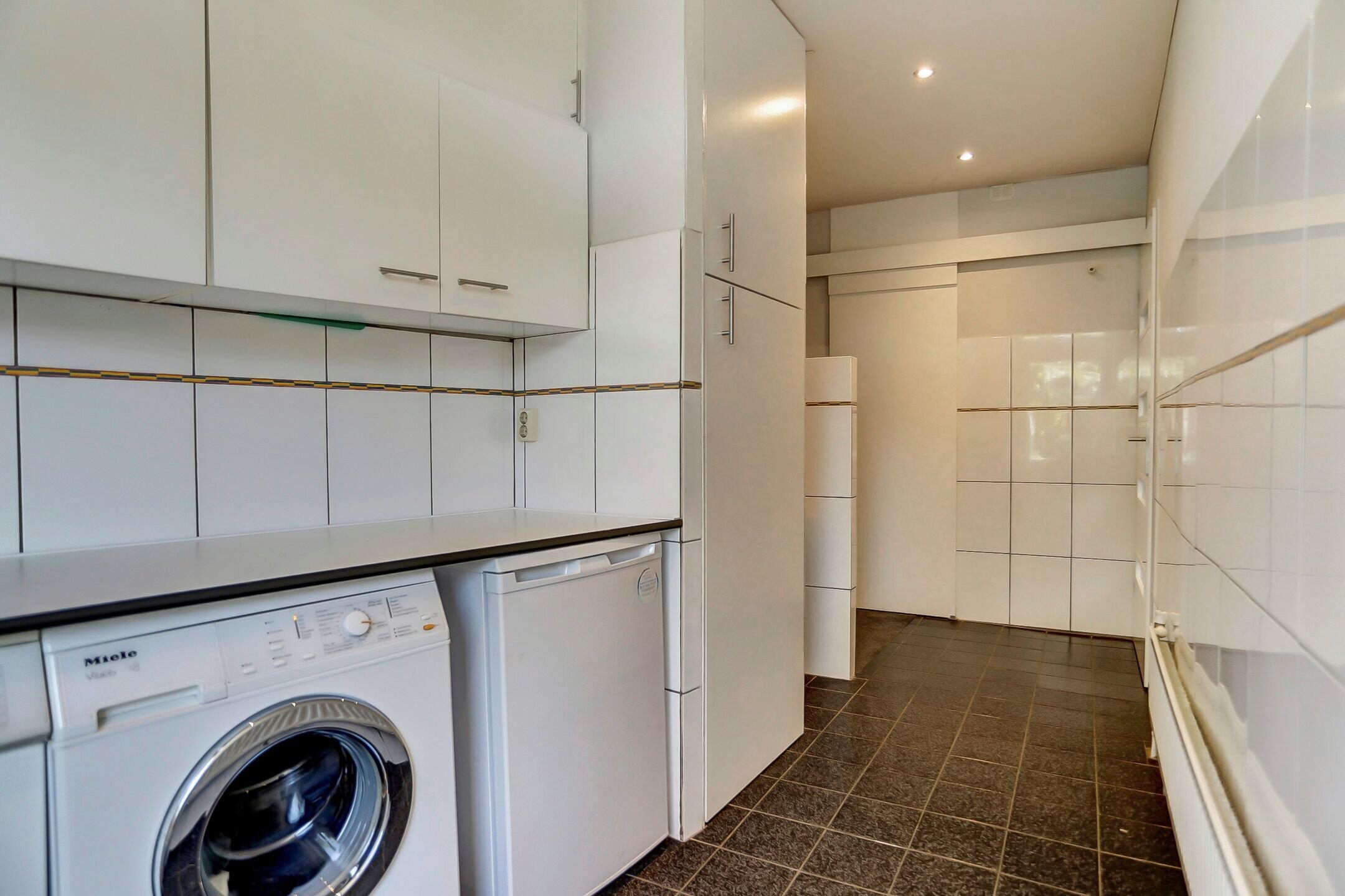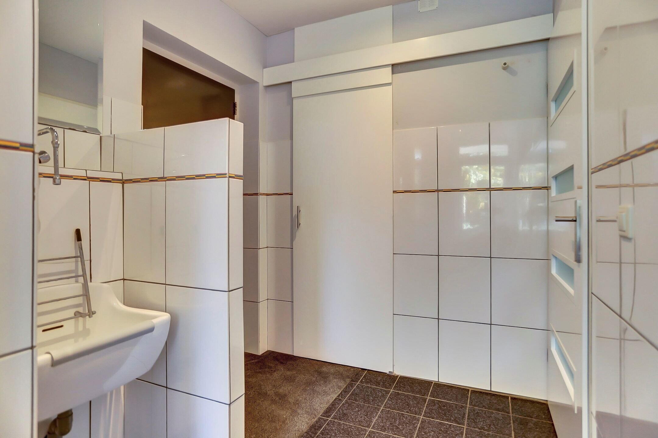 Aansluitend ligt de bijkeuken, een praktische ruimte met trapkast, muurkasten en bovenkastjes voor nog meer bergruimte. Hier vind je ook de witgoedaansluitingen en een wasbak met warm en koud water. Vanuit de bijkeuken heb je directe toegang tot zowel de tuin als de carport, wat zorgt voor extra gemak in het dagelijks gebruik.