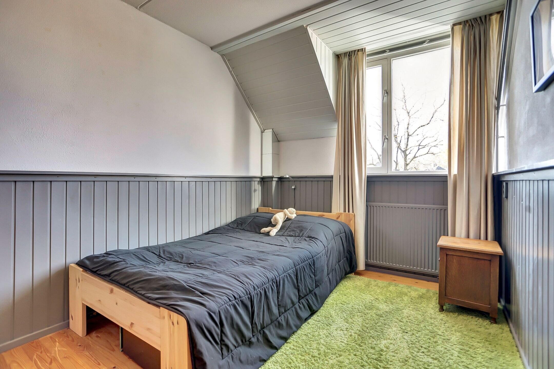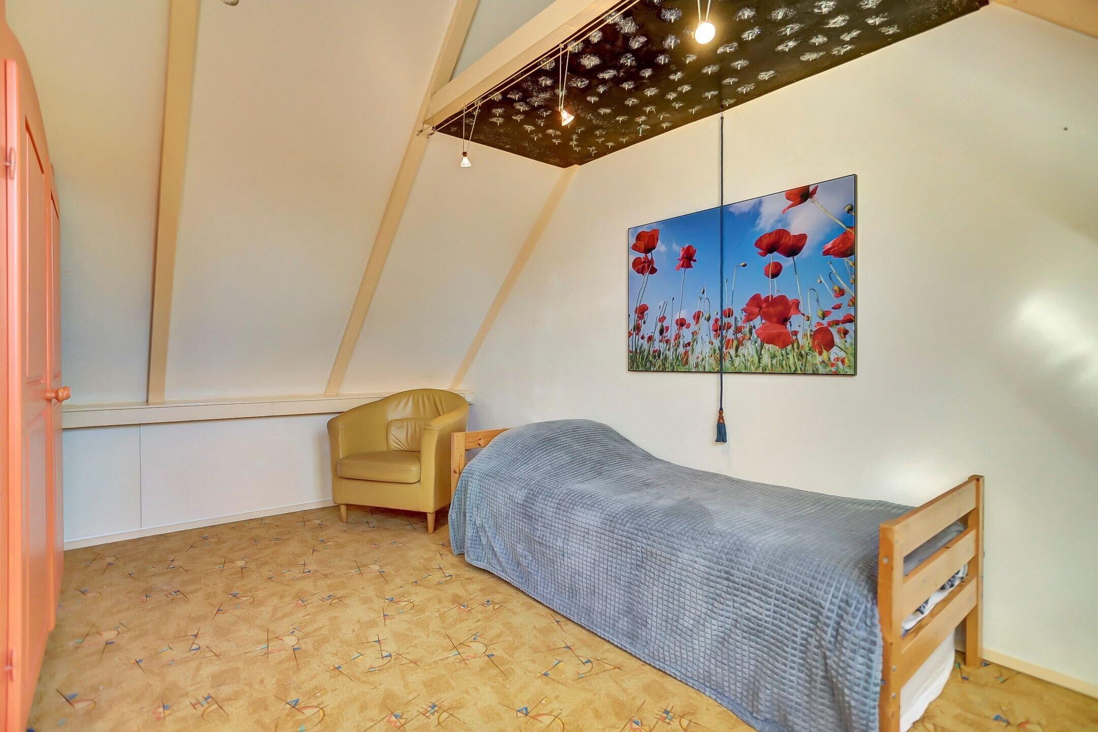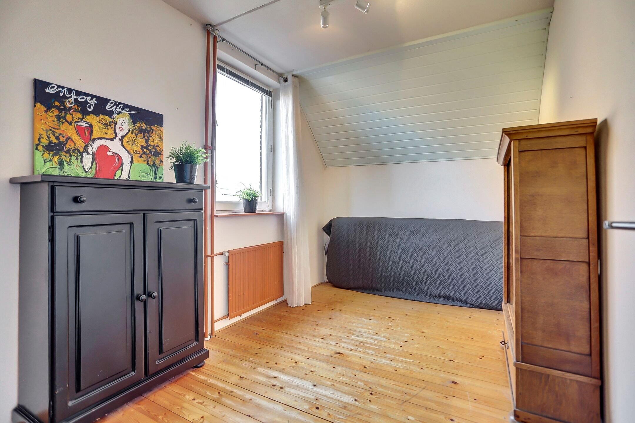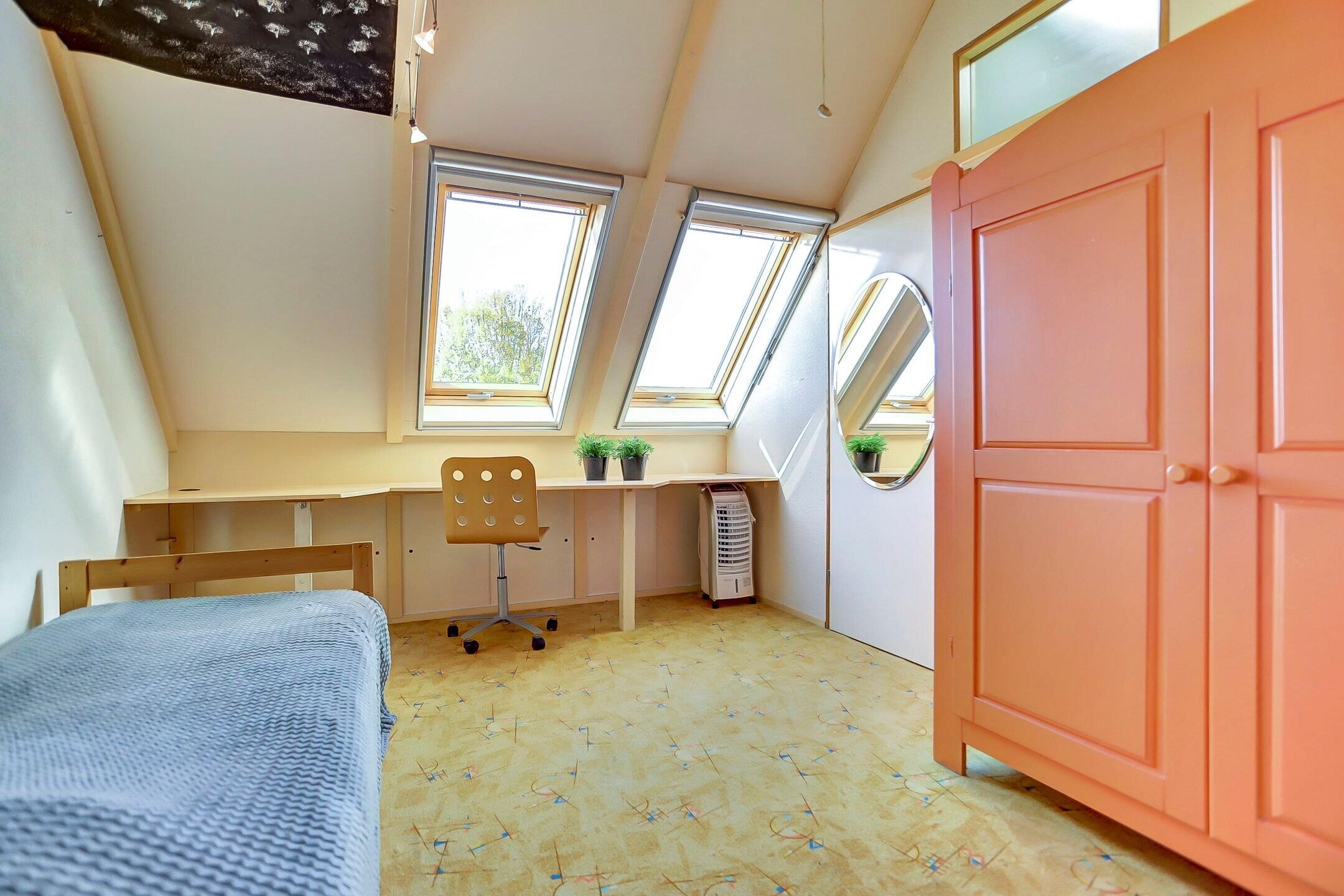 Op deze verdieping is ook een vierde slaapkamer aanwezig, een fijne en lichte kamer dankzij de twee Velux-dakramen die zijn voorzien van rolluiken en horren. Het vaste bureau maakt de kamer ideaal als werk- of studeerruimte waarbij de beschikbare ruimte optimaal wordt benut. Een bijzonder detail is de sterrenhemel halverwege het plafond die een sfeervol element vormt dat niet alleen zorgt voor een leuke uitstraling in de kamer maar ook voor extra bergruimte in de nok.