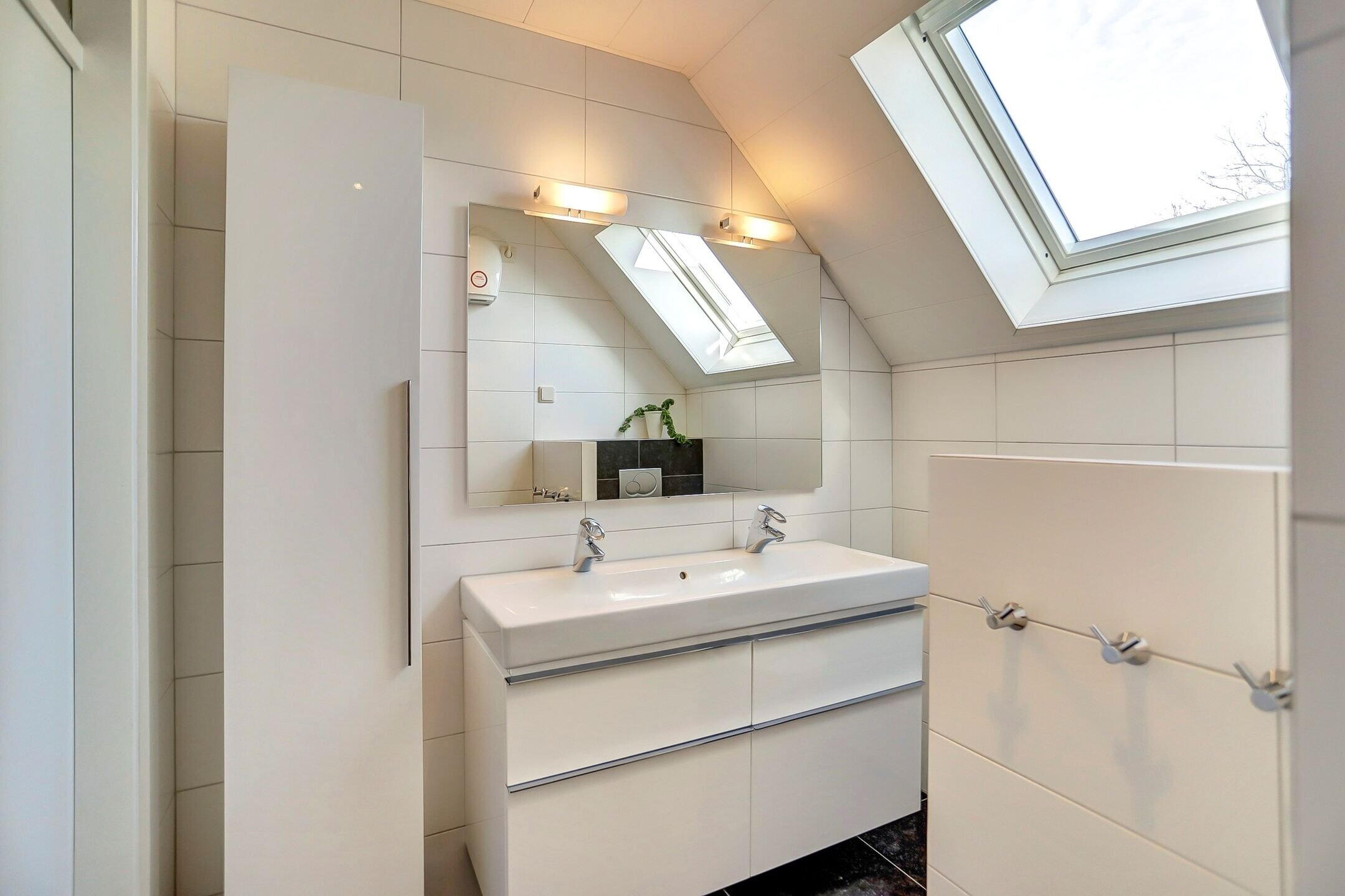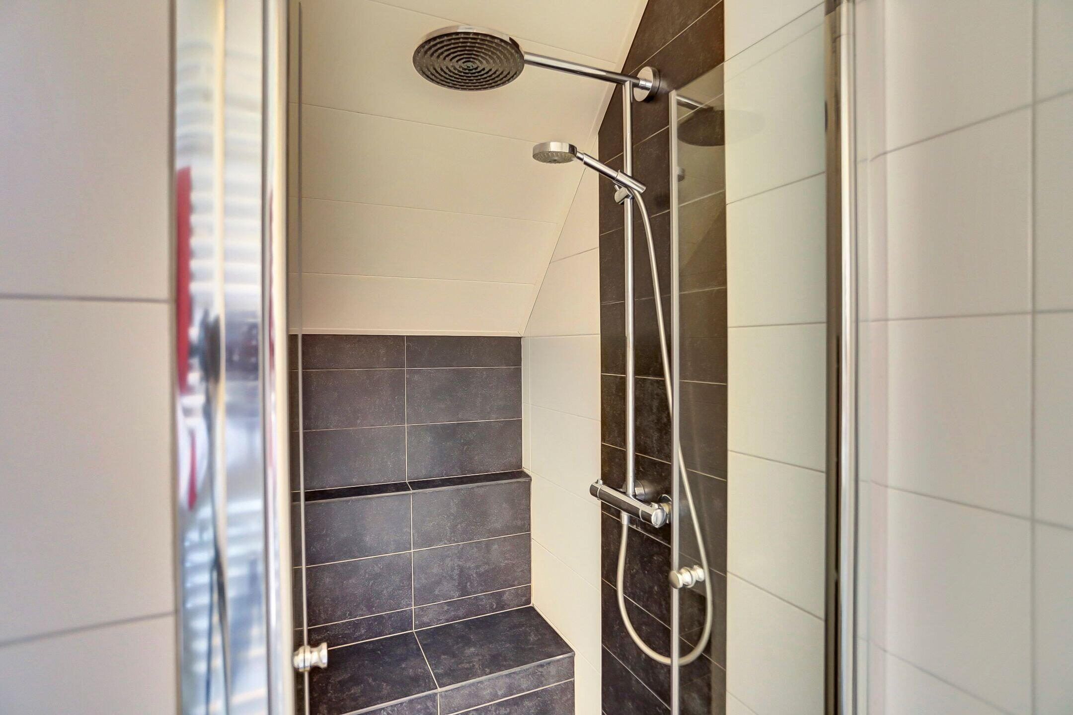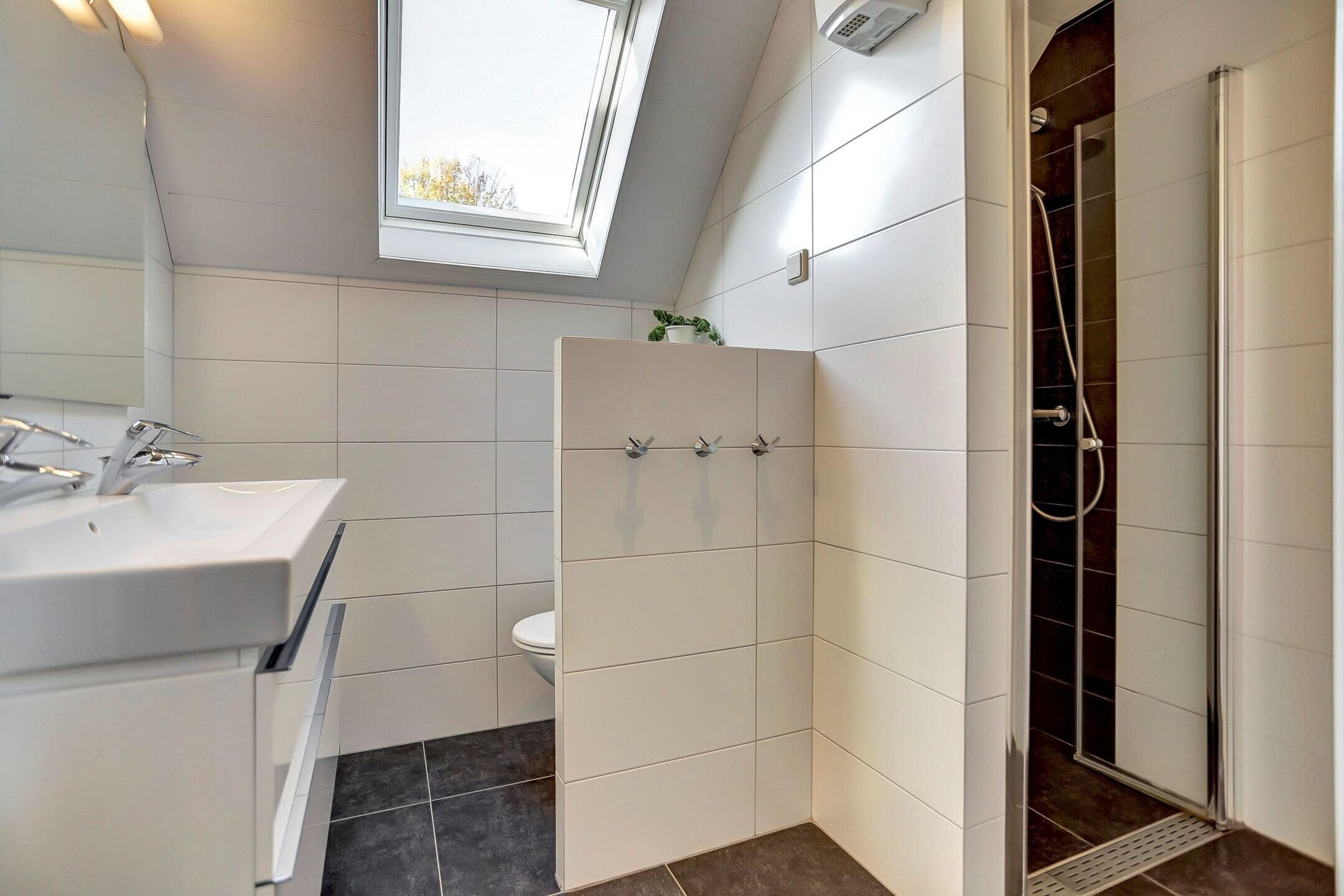 De badkamer is een fijne plek om de dag te beginnen of ontspannen af te sluiten. Je vindt hier een inloopdouche, dubbele wastafel met opberglades en een extra hangmeubel, een toilet en een designradiator. Hoewel er geen vloerverwarming aanwezig is zijn de verwarmingsbuizen onder de tegelvloer gelegd waardoor de vloer toch aangenaam warm aanvoelt. De badkamer is afgewerkt met lichte wanden en een donkere tegelvloer voor een modern contrast. Een dakraam zorgt voor natuurlijke ventilatie terwijl er ook mechanische afzuiging aanwezig is.