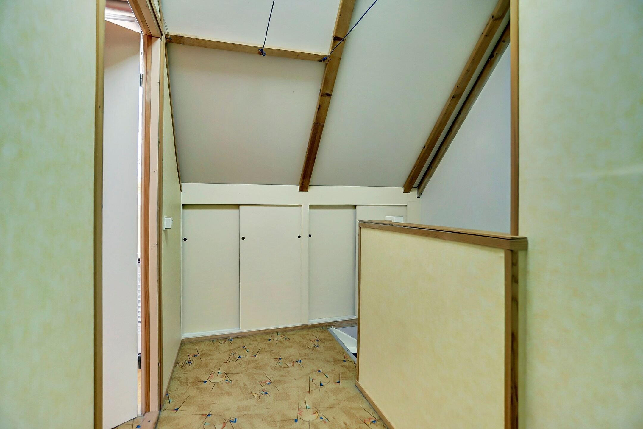 De zolder is bereikbaar via een vaste trap en biedt verrassend veel extra ruimte. Je komt eerst op de overloop waar onder de schuine wanden praktische opbergruimte is gecreëerd. Aan de linkerkant bevindt zich nog meer bergruimte en hier hangt de Atag CV-ketel (2024).